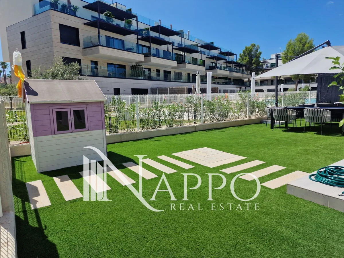 Nappo Real Estate tiene el placer de presentar esta lujosa planta baja con un jardín enorme está situado en un complejo residencial único de reciente construcción en Santa Ponsa, en el suroeste de Mallorca. El piso se distribuye en una superficie construida de aprox. 141 m2, más aprox. 11 m2 de terrazas abiertas y 122 m2 de jardín. La zona de entrada conduce al luminoso salón con zona de comedor y cocina americana equipada. Desde aquí y desde todas las demás habitaciones se accede al jardín privado. Además, el piso dispone de cuatro dormitorios, uno de ellos con baño en suite, otro baño independiente. La coladuria esta situada al lado de la entrada de la vivienda. El equipamiento de la propiedad incluye: Circulación de aire regulada (aerotermia), calefacción por suelo radiante (regulable individualmente), aire acondicionado central frío/calor, ventanas de aluminio con doble acristalamiento, persianas enrollables, conexión telefónica, ascensor, armarios empotrados y suelo laminado. En la amplia zona comunitaria hay una gran piscina rodeada de terrazas soleadas, un hermoso jardín, un parque infantil y una zona de fitness. Además, la oferta de la propiedad incluye dos plazas de aparcamiento. Este complejo residencial tiene además altos estándares de privacidad, provisto de conserje, videovigilancia 24hrs Gracias a la ubicación ideal de esta residencia de nueva construcción, se puede llegar al centro de Santa Ponsa en pocos minutos a pie. Aquí encontrará la maravillosa playa de arena, una amplia gama de restaurantes con cocina mediterránea e internacional, así como instalaciones comerciales y numerosas tiendas de moda. El puerto deportivo de Port Adriano está a unos 10 minutos en coche. Para ir de compras o visitar museos y edificios históricos, la capital de la isla, Palma de Mallorca, está a sólo 20 minutos y el aeropuerto internacional está a unos 30 minutos en coche.